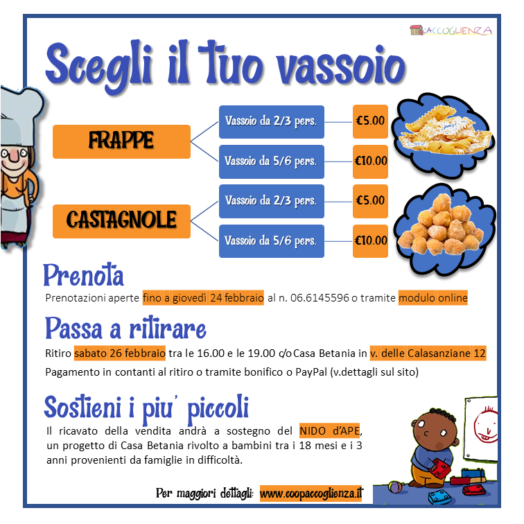 - PRENOTA il tuo vassoio di frappe e/o castagnole compilando il modulo qui sotto, o chiamando il n.06/6145596 (dal lun. al ven. dalle 9.00 alle 15.00). C’è tempo fino a GIOVEDì 24 FEBBRAIO per ordinare.